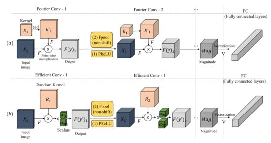 As shown in Figure 6, let us assume that , , and represent the ith spatial input, spatial kernel, random kernel and scalar, respectively. Each and for ith layer refers to the output of a Fourier CNN and an efficient Fourier CNN, respectively.