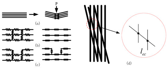is the electrically ineffective length; that is, due to the fracture and damage of the carbon fiber, the original conductive path can no longer carry current, and the adjacent contact fiber is a new conductive path, so the electrically ineffective length is the distance between adjacent contact points, as shown in Figure 2d. As shown, the value of is the average length of the fiber contact point, is the overall Young’s modulus, and are the material failure parameters of the Weibull distribution.