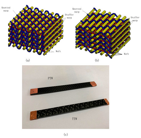 Compared with TTW three-dimensional materials, the knotted warp yarn of PTW passes through two weft yarns in one cycle, and TTW three-dimensional woven material passes through four warp yarns in one cycle, as shown in Figure 3a,b. The two materials connect the two layers of carbon fiber woven fabric through the knotted warp yarn, thereby obtaining better high delamination resistance and high strength in the thickness direction. The relevant parameters of carbon fiber are shown in Table 1.