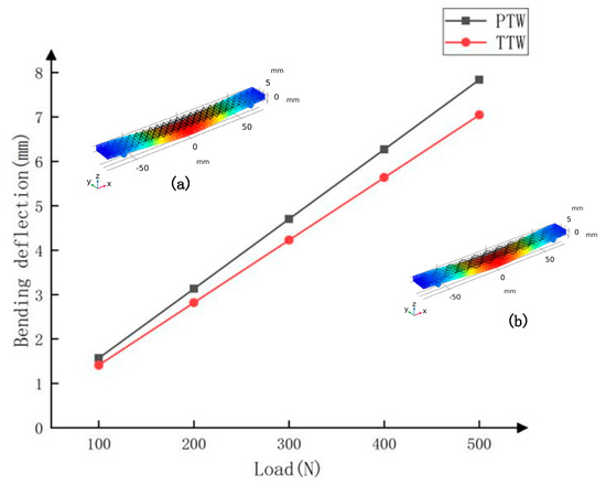 To explore the situation of the two structures under a three-point bending force, the length of the middle part of the model is 3 mm to simulate the width of the lower indenter, and two cylinders with a span of 122 mm are placed under the sample as fixed constraints to simulate the supporting roller. Set the downward force on the upper surface of the middle part to simulate the applied load P. PTW and TTW bending deflection curves under force as shown in Figure 4. The relevant mechanical setting parameters are shown in Table 2.