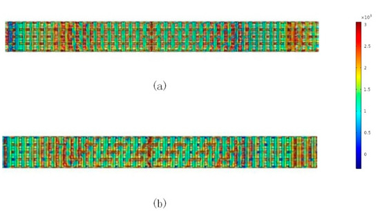 When the same load of 500 N is applied, the component distribution diagram of the principal stress in the z-axis direction (MPa): (a) the top view of the PTW structure, and (b) the top view of the TTW structure.