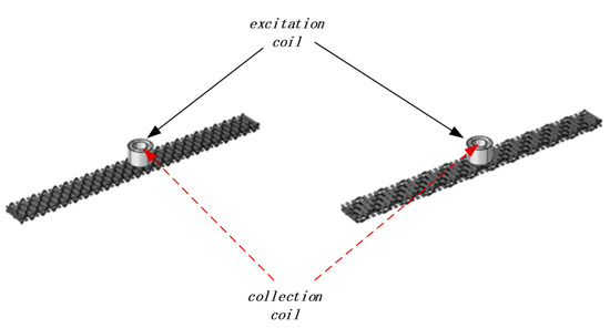 The height of the two coils is 8.6 mm, and the number of turns is 100 r. The model is shown in Figure 6. To obtain a strong signal as a whole, the radius of the excitation coil is set to 6.2 mm.