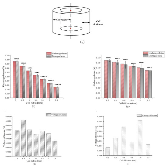 From Figure 7b, a series of coils with different radius are tested, and it can be found that as the coil radius decreases, the overall signal also decreases. However, the difference between the voltage values in the non-damaged and damaged state is found to be the largest when the radius is 4.6 mm, indicating that the radius of 4.6 mm is the most sensitive to damage response.