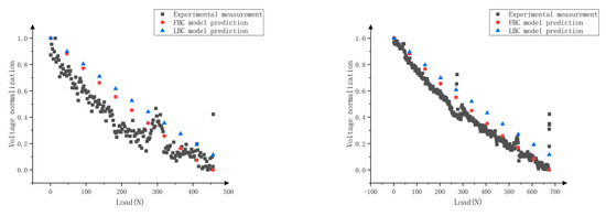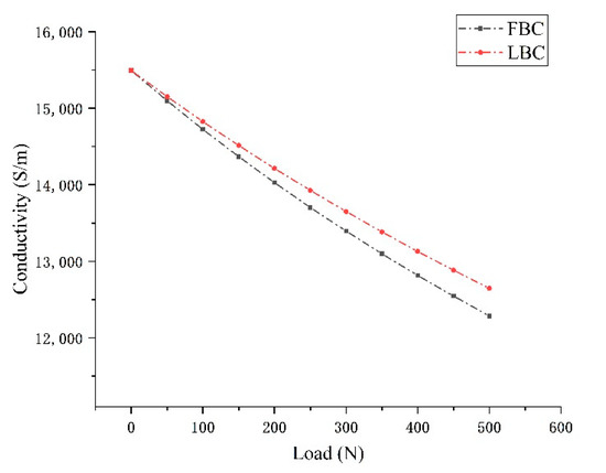 In the simulation, we use the LBC and FBC models to determine the conductivity. We choose a 500-N load and observe the trends of the two models, as shown in Figure 8. The results show that the FBC model is used to solve the conductivity. The parameters are shown in Table 3. The change trend is greater than the change trend of the LBC model, but the difference between the two is not large, showing that the damage caused by the fiber load will affect the electrical conductivity.