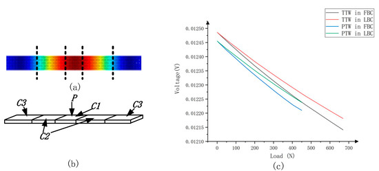 The conductivity values of the two structures are set within the average load pressure range. The different load sizes of the two structures are the average load that the two structures can withstand in the reference experiment. The PTW is 450 N and the TTW structure is 670 N. After calculating the LBC model and the FBC model separately, the coil voltage curves of the two structures are obtained, as shown in Figure 9c. The coil voltages of the two structures have the same change trend, and they decrease exponentially with increasing load.