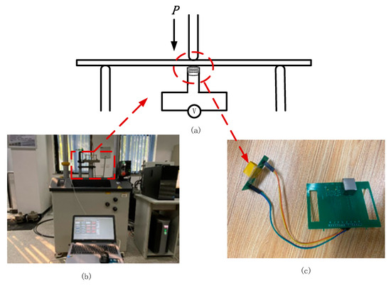 The mechanical structure of CFRP can be regarded as a connection of multiple tiny springs, and its electrical structure can be regarded as a series-parallel network of multiple small resistances. As shown in Figure 2b,c, the left half is the schematic model of the micro spring of the mechanical fiber, and the right half is the electrical resistance change model. with the application of load, the mechanical structure of CFRP changes after the carbon fiber breaks. The load-bearing capacity is reduced, its electrical structures are connected to each other due to the broken fibers, and a new conductive network is formed again.
