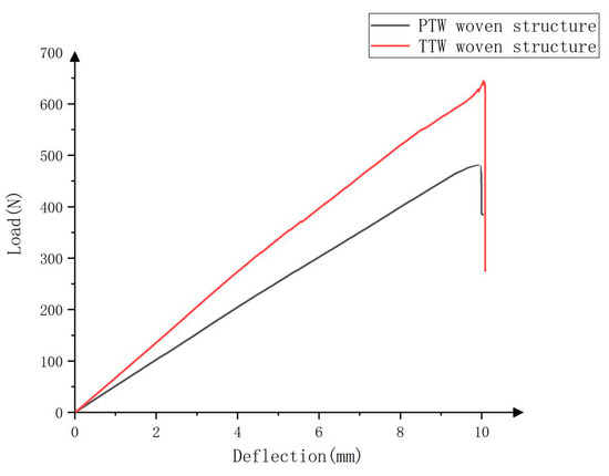 In the experiment, the constant pressing rate of the universal strength machine is set to 1 mm/min. To prevent the sample from slipping, a 2 N preload is applied. Figure 12 shows the deflection-load curve of the two structures. The average loads of the PTW structure and TTW structure samples are 465.98 N and 671.98 N, respectively. The figure shows that before fracture, the load increases linearly with the deflection. When the deflection reaches 10 mm, the load decreases rapidly. The specimens of the two structures fail. At this time, a large number of fibers break, and the matrix cracks.
