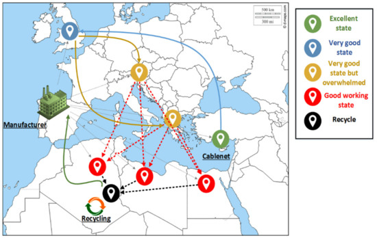 Figure 1 illustrates an emulated iteration of the CE-IoT loop. As aforementioned, our organization (Cablenet) uses its equipment to serve end-customers. When the system is upgraded, the related machinery is sold to start-ups in the UK. Similarly, these companies can re-sell the CE assets when their utility goes beyond a threshold. Afterwards, the assets are gifted to third-world countries that use older technologies in their networks. When the products are no longer working, they are recycled in businesses that are close to these areas. Finally, a subset of useful materials is exported back to the manufacturers and the loop starts again. Instead of just dropping the equipment, which could end up in landfills or swamps, the working lifetime is to prolong as much as possible and the useful materials are recycled, implementing an advance green computing and e-waste management infrastructure.
