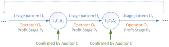 Every participating organization has its own “wallet” with its blockchain accounts. Normally for the CE-IoT blockchain, each organization will possess a single “account”. The account is managed by the organization’s master agent, which gathers information from its underlying field agents and adds the performed actions to the chain. These recorded actions have the form of valid blockchain “transactions”, which are signed by the master agent using the organization’s private key. Normally, the operator registers sequential usage patterns for an asset, which can be then verified by auditors (see Figure 3).