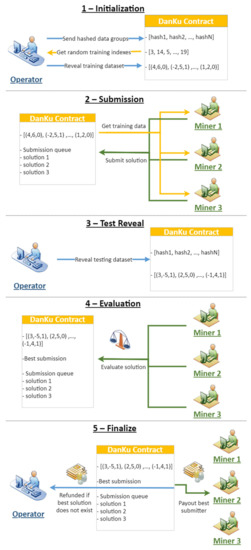 The DanKu protocol [61] resolves this issue and allows the participating entities to solicit ML models for a reward in a trustless manner. We apply this approach in order to support the federated learning functionality of the CE-IoT ecosystem. The protocol is composed of five phases. At first, the asset operator (i.e., the organizations MA) constructs a contract that contains the hashed data groups of the sensed events along with the training dataset. The miners obtain the contract, train the model, and send the computed solution. Then, the operator reveals a testing dataset and the submitted models are evaluated. The best solution is rewarded and the related miner is paid. If there is no best solution, the operator is refunded. Figure 5 depicts the five phases of the DanKu protocol for ensuring that a contract has been performed successfully.
