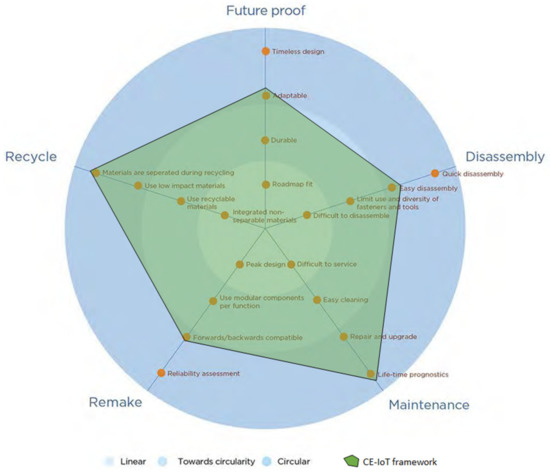 Concerning the effectiveness of our approach and the benefits for the CE ecosystem, a radar graph is produced on a spider map for CE applications [64]. The spider map evaluates the following five CE properties of: (i) disassembly, (ii) maintenance, (iii) remake, (iv) recycle, and (v) future proof. Four levels are defined for each property based on the effectiveness of the overall solution—the outer the map center, the better. The suggested CE-IoT system can greatly prolong the working life of CE assets, improving the maintenance aspects. The federated learning aspects are foreseeing potential breakdowns of the equipment and enable adaptable operations and policies. In general, the CE assets that are examined in the ICT domain use modular components that support forward/backward compatibility and can be easily disassembled, and their materials can be separated during recycling. The CE-IoT system supports the monitoring of these components throughout the CE cycle. The radar analysis is depicted in the following Figure 6.