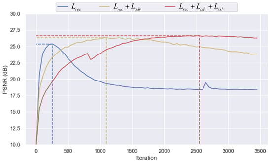 As depicted in Figure 7, when only reconstruction loss is used, the optimization process becomes overfitted within approximately 500 iterations, resulting in poor performance. When the noise estimation method is applied, the optimization process performs stably without overfitting in the early stage. Furthermore, after 800 iterations, our framework with the noise estimation method outperforms the case that only reconstruction loss is used. The final proposed model, which includes both the noise estimation method and SSL, not only shows the most stable optimization process but also achieves the best performance. At the 2000th iteration, our final model shows the best performance compared to the other methods. Although the number of iterations is set to 2000 in DIP [], we optimized each algorithm to run for 3500 iterations to show the independence from early-stopping. We can therefore confirm that even when the number of iterations exceeds 2000, the performance of our method improves steadily.