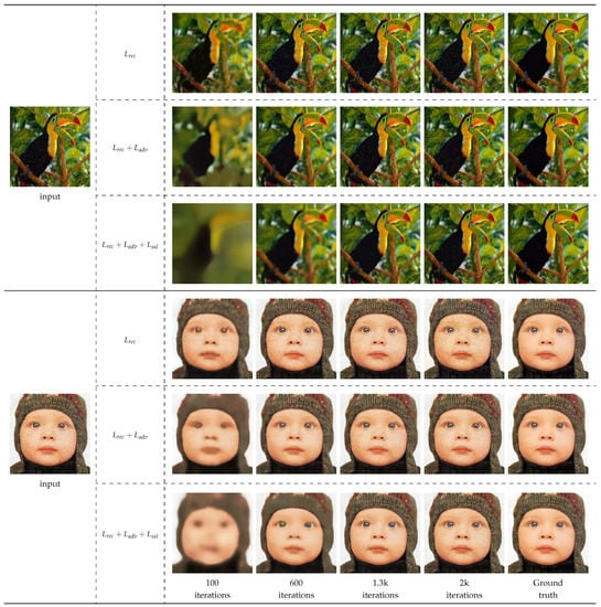 Ablation study for “bird” image and “baby” image in SET5 dataset (, ).