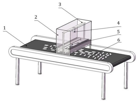 Main structures of the acquisition equipment. 1. Conveyor belt. 2. Camera bellows. 3. Fixing device. 4. Industrial camera. 5. Strip light source. 6. Hard candies.