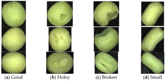- Lin, P.; Xiaoli, L.; Li, D.; Jiang, S.; Zou, Z.; Lu, Q.; Chen, Y. Rapidly and exactly determining postharvest dry soybean seed quality based on machine vision technology. Sci. Rep. 2019, 9, 1–11. [Google Scholar] [CrossRef]