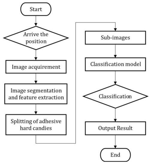 Computer vision is considered one of the best alternatives for performing an online and nondestructive quality inspection [1]. Nowadays, many applications that utilize computer vision on food industry products have been developed, especially in the defect-detection area. Many external properties, such as the color, shape, texture, and wavelet features (or combinations of these) are extracted from images, and these features are then used to train classifiers. For example, Chao et al. proposed a multi-step hybrid identification method based on the color sorting table method (CSTM) to identify and remove various foreign bodies in the production process of tobacco packs, with an accuracy rate of 97.8% [2]. Carvalho et al. assessed the quality of macadamia kernels by using near infrared spectroscopy (NIRS) and nuclear magnetic resonance (NMR) with chemometric tools such as PCA-LDA and GA-LDA to evaluate external kernel defects [3]. Lu et al. used the random forest (RF) to detect defective apples [4]. Some researchers have used support vector machines (SVMs) to detect defective fruits and vegetables, such as potatoes, bulk raisins, and rice [5,6,7,8,9,10,11], while others have used the Hough transform (HT) [12] and extreme learning machine (ELM) [13] to sort carrots and tomatoes. Although most defective hard candies can be easily distinguished from good ones by machine vision methods, a few defective hard candies with similar phenotyping may significantly confuse these recognition algorithms, which is not conducive to achieving high-quality sales and industrial upgrading for candy-producing companies.