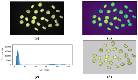 where is the color channel of pink; , , and represent the three-color brightness channels from 0 to 255, respectively; is the highlight coefficient of the red channel, which was found appropriate at the value of 0.5 after several experiments in this work; So that the ranges from −255 to 255. In order to process and display results conveniently, the values of were changed into the scale from 0 to 255. The original candy image is shown as Figure 4a, and the thermodynamic image of the transformed pink channel is shown as Figure 4b. Figure 4c shows the histogram of the pink channel, and there is clear difference between the foreground and the background. The threshold_li method [25,26] can give the best threshold by minimizing the cross-entropy between the foreground and the foreground mean, and the background and the background mean. Taking the advantage of the threshold_li method, the mask of the hard candy is easily split out from the background as shown in Figure 4d.