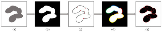 The adhesive cases were found by the procedure in Section 2.2, and they could not be completely avoided and required further processing. A segmentation algorithm based on concave point detection and ellipse fitting [27] was used to split the adhesive hard candies. This procedure was composed of a determination of adhesive candies, concave point detection, contour segment grouping, and ellipse fitting, shown in Figure 5.