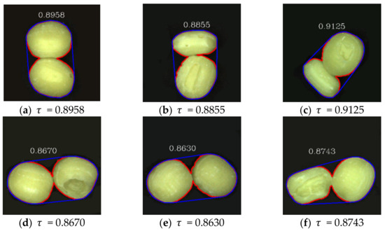 where refers to the area. The convex hull is the smallest convex set containing the adhesive candies. The index offers a direct and general idea of the appearance of the adhesive candies, which ranges from 0 to 1. The value of index is smaller when there is adhesion. Figure 6 shows some typical examples of adhesive candies and their corresponding convex hull. The red line is the boundary of the candy, and the blue line is the convex hull.