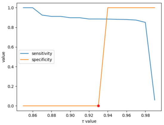 The sensitivity measures the proportion of positives that are correctly identified as such, and the specificity measures the proportion of negatives that are correctly identified as such. Figure 7 shows these two indexes change when increases from 0.85 to 0.99. It is clear that the red point in Figure 7 is the optimized point, so that the threshold is set as 0.93 for value to determine whether there is adhesion. Specifically, when the value is smaller than the threshold, the candy is considered as an adhesive candy; otherwise, it is considered as a non-adhesive candy.