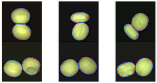 In order to obtain the contour boundary of the adhesive hard candies, an ellipse fitting method [29] based on the least square method is used to complete the adhesion segmentation, as shown in Figure 9. The blue line is the boundary of the fitted ellipse.