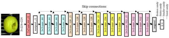 Besides the aforementioned algorithms, a new branch of machine learning called deep learning has achieved many state-of-the-art results in the field of image classification in recent years [14]. Deep learning refers to the use of deeper ANN architectures that combine the process of feature extraction and classification. It encodes the composition of lower-level features into more discriminative higher-level features. Thus, deep learning can solve more complex problems with higher precision. The convolutional neural network (CNN) [15] is a basic deep learning tool, and it has been successfully used in image classification and object detection. The use of a CNN is a new and promising technique that has become more popular in the field of defect detection in agricultural products and industrial parts. Arthur et al. trained the deep residual neural network (ResNet) classifier to detect the external defects on tomatoes, and they found that fine-tuning outperformed feature extraction, revealing the benefit of training additional layers when sufficient data samples are available [16]. Xu et al. proposed a feature-wise attention-based relation network (FAR-Net) for multilabel jujube defect classification, which effectively facilitated the learning of correlation between labels and improved the multilabel classification accuracy [17]. Ahmad et al. used an improved CNN algorithm to detect the apparent defects of sour lemon fruit and graded them [18]. Zhang et al. proposed a new defect detection pipeline, called Image Enhanced Mask R-CNN (IE Mask R-CNN), that includes the best combination of image enhancement and augmentation techniques for pre-processing the dataset, and a Mask R-CNN model tuned for the task of wind turbine blade (WTB) defect detection and classification [19]. Duong et al. used the resultant defect signature wavelet image (DSWI) and designed the deep convolution neural network architecture to identify the fault in the bearing [20]. In addition, Zhuang et al. [21] used the CNN to classify solid wood flooring; Wan et al. [22] and Wang et al. [23] used the CNN to classify the steel surface defects; Zhou et al. [24] used the CNN to classify the defective green plums. Therefore, these algorithms provide a good reference for the research on the classification of defective hard candies.