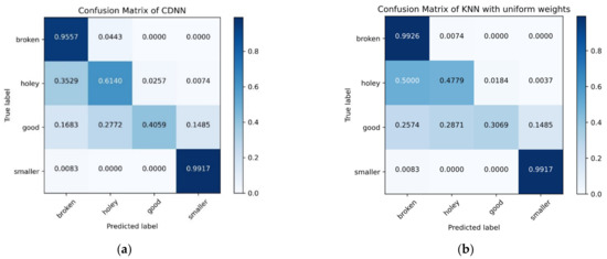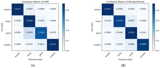In order to further analyze the performance of the traditional models, the detective accuracy of each type of defect were also calculated and their confusion matrixes are shown in Figure 11. Comparing the deep learning models, the traditional methods classified defective hard candies (broken and smaller candies) into good ones, which is unacceptable in the actual production.