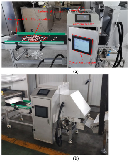 Physical map of defective hard candy intelligent sorting system, where (a) is for experiments and debugging and (b) is installed in the production line.