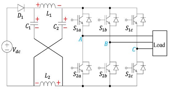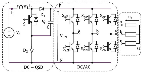 Single-stage direct boost inverters are widely used in electrical systems such as wind power, solar cells (PV), UPS, and electric vehicles [1,2,3,4]. There are two types of single-stage direct boost inverters: the Z source inverter (ZSI) [5,6] (Figure 1) and the quasi switched boost inverter (QSBI) [7,8] (Figure 2).