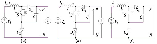 In Table 1, the vectors and that are located at the center of the space vector hexagon are zero vectors. In the vector state or , the outputs a, b, and c are connected through N or P [8,9]. Therefore, the VPN voltage does not affect the load at this time, so it is possible to short-circuit P–N to store the energy in the inductor L. There are three main operation modes in the 3P2LQSBI circuit: short-circuit for the booster (SB), non-short circuit (NST), and short-circuit on the inverter side (ST). Figure 4 shows the operation modes of 3P2LQSBI.