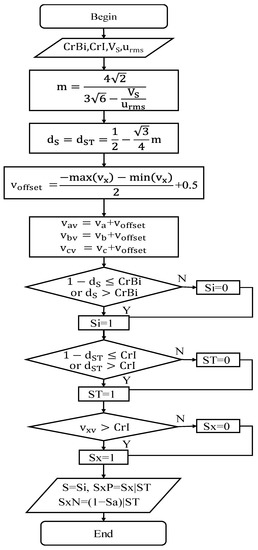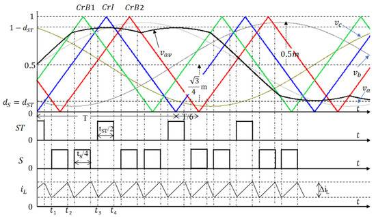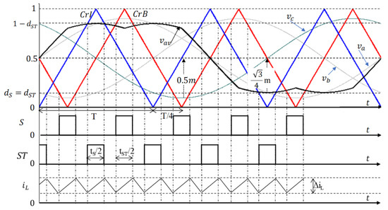 A QSBI controlled by two carrier techniques is presented in [16,17]. This technique uses two triangle carriers, one for the inverter and the other for the booster. They are 90° phase shift triangle carriers. Because the tS and tST are the same as shown in Figure 5, the duty cycle on the DC–DC boost and the inverter are the same too, and if the offset function is the third harmonic component, they have the same values as in Formula (7):