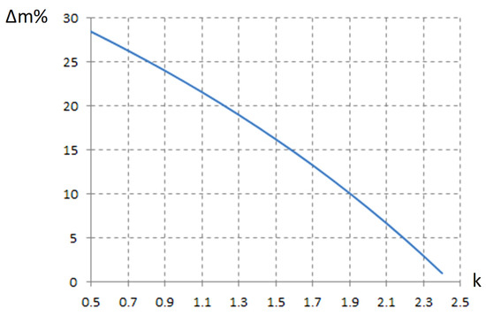 Figure 7 shows the ability to increase the modulation index (m) with the ratio (k). Figure 7 shows that the effect of increasing the modulation index decreases as the k ratio increases. The efficiency increase in the modulation index of the technique corresponds to the ratio . For example, with power supply VS = 55 V, referent output voltage urms = 110 V, meaning k = 0.5 if the proposed algorithms are used and the modulation index can be reduced by 29% compared with the method used in [16]. Compared to the two carrier technique, the voltage across the capacitor (C) will decrease with :