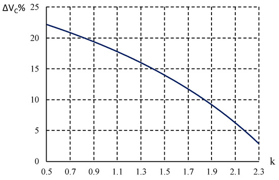 Figure 8 shows that the reducing effect (of the voltage on the DC link) decreases in the k range from 0.5 to 2.2. When applying the proposed algorithm at k = 0.5, the DC link voltage is less than 22% compared to conventional techniques. With (19) and f = 1/T, the ripple of the input current can be calculated using Formula (24):