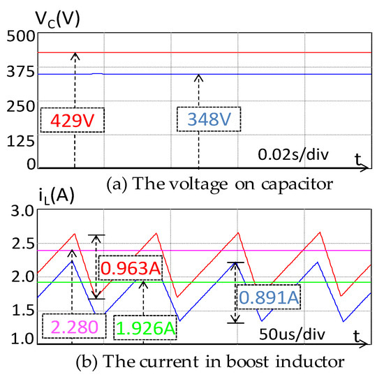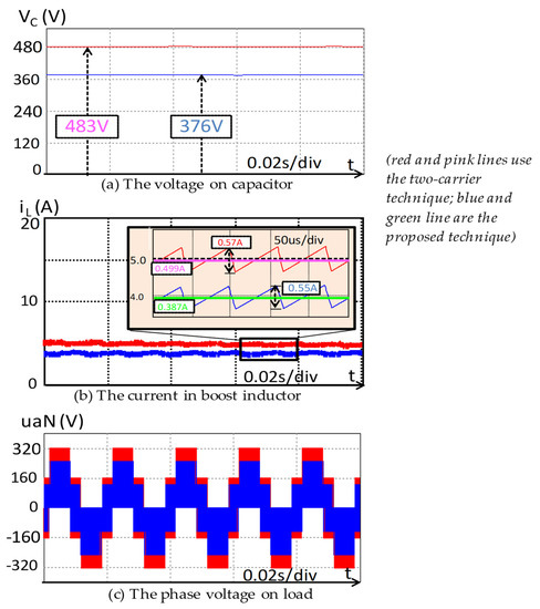 Figure 11 shows the simulation results with VS = 55 V. From the top to the bottom of Figure 11, the first graph (Figure 11a) is the voltage of the capacitor, the second is the current in the boost inductor (Figure 11b), and the third is the inverter output voltage (Figure 11c). Red lines are with two carriers, and the blues are with the proposed algorithm. It is easy to see that the capacitor voltage reduces from 483 V down to 376 V. ΔVC is 107 V, a 22.15% reduction, and the input current ripple reduces from 0.569 A down to 0.550 A, a 3.5% reduction. Moreover, the average input current also decreased from 4.99 A to 3.87 A, equivalent to a 22.4% reduction. These values are presented in Table 2.