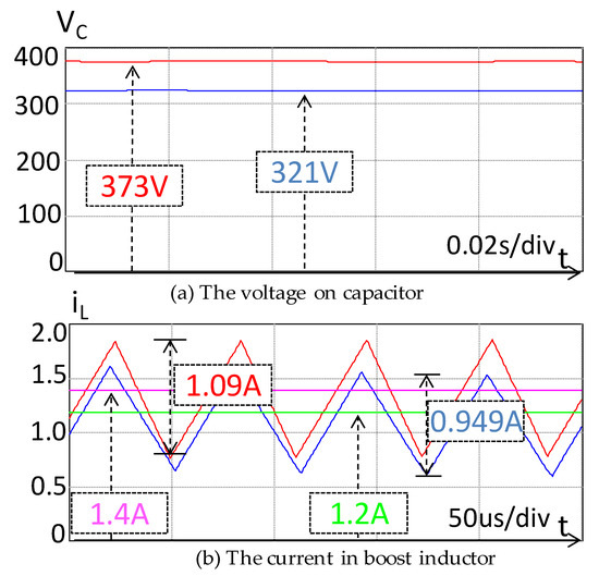 The same can be seen in Figure 12 and Figure 13, with Vs being 110 V and 165 V, respectively. When VS is 110 V, the voltage of the capacitor reduces to 348 V with ΔVC being 81 V (an 18.9% reduction) (Figure 12a) and the input current ripple reduces from 0.963 A down to 0.891 A (a 7.47% reduction) (Figure 12b).
