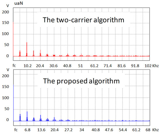 The FFT of the phase voltage is shown in Figure 14, with the red graph being the two-carrier and the blue graph being the proposed algorithm. It is easy to see that at a frequency of 2fc, the amplitude of the harmonics with the two-carrier technique is higher than it is in the proposed algorithm. This is not a problem because the proposed method has a higher modulation index.
