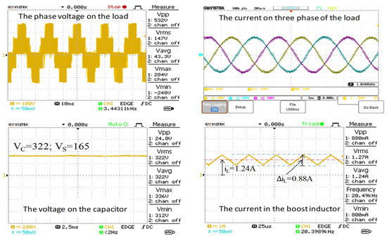 The experimental results with a DC supply of 165 V, including the phase voltage, load currents, capacitor voltage, and the boost inductor (Figure 17) show a similar trend.