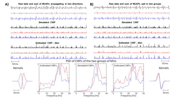 The proposed method estimates the kernels on the basis of the signal. In the case of different directions of MUAP propagation (i.e., more IZs or pinnate muscle), a single kernel was chosen to fit the PSD of the data and it was selected together with a second one with opposite phase. On the other hand, when a muscle with parallel fibres and a single IZ was considered (so that small differences in MUAP shapes were determined only by different CVs and positions of the MUs), kernels with different time scales were selected, again based on the PSD of the signal (as shown in Figure 2).