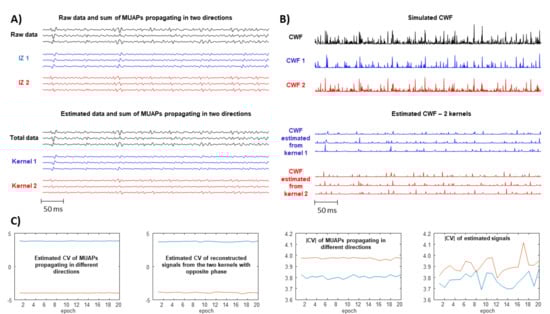 Additional representative examples of applications are provided, focusing on outputs that only the new algorithm can provide: discrimination of MUAPs propagating in different directions to estimate their CWFs or global CVs; inter-muscular coherence, for which the coherence of the simulated CWFs was the reference.