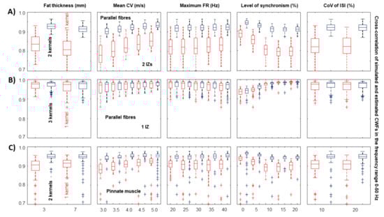 Cross -correlation of the low frequency contributions (up to 50 Hz) of the simulated CWF and estimated by either the single-kernel (red) or multi-kernel method (black). Each estimation was obtained considering single channel SD EMG at 80% MVC with a duration of 10 s. Data are shown after pooling with respect to specific values of fat layer thickness, mean MU CV, maximal FR, level of synchronization of MU firings, and CoV of ISI. Different simulation models are considered: (A) cylindrical volume conductor with parallel fibres and two IZs (50% of MUs innervated under each IZ; uniform distribution of MU size among different IZs); (B) same volume conductor as in (A), but considering a single IZ; (C) pinnate muscle with fibre inclined with respect to the skin surface.
