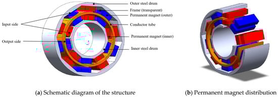 The structure of a CPMC is shown in Figure 1. It is mainly composed of inner and outer steel drums, inner and outer permanent magnet blocks, inner and outer frames, and a conductor tube. In general, the conductor tube is the output side, which is connected to the output shaft, and the permanent magnet drum—which includes inner and outer permanent magnet drums—is the input side, which is connected to the input shaft. The permanent magnet block is a cuboid and is embedded in the frame; the magnetization direction of the permanent magnet is along the radial direction; the magnetization directions of the red and blue permanent magnet blocks are opposite; and there are air gaps between the conductor tube and the inner and outer frames, which can achieve non-contact transmission.