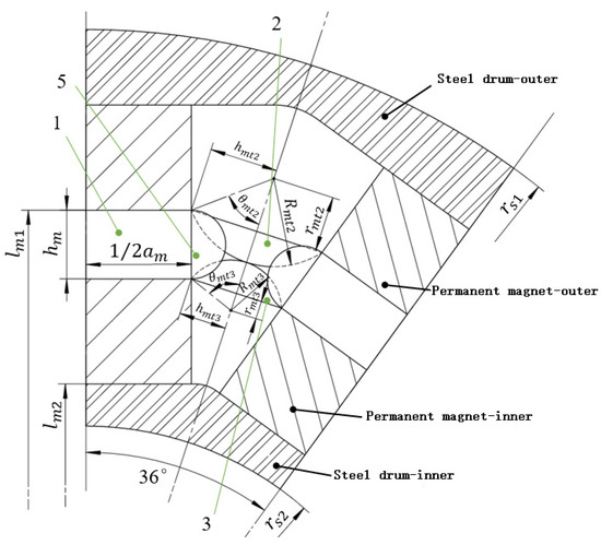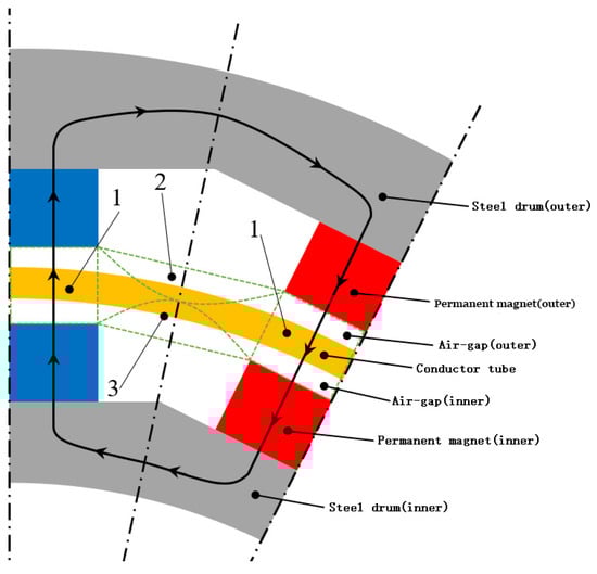CPMC is symmetrical in the circumferential direction; hence, the objective of this study was to design a model for a single magnetic circuit. As shown in Figure 2, the main magnetic circuit and air gap magnetic flux leakage are divided into regular magnetic flux tubes using the magnetic field division method [17,18,19,20,21]. The permanent magnet is divided into two equal parts along the radial direction, and the polarization is in the radial direction; however, the direction of magnetization of the adjacently placed permanent magnets is opposite. The arrow in Figure 2 indicates the direction of the main magnetic circuit. First, it passes from the inner permanent magnet through the conductor tube and air gap to the outer permanent magnet (magnetic flux tube 1 enclosed by the green dashed lines). Then, it flows along the steel drum to the adjacent outer permanent magnet with the opposite polarization direction and again passes through the conductor tube and inner permanent magnet. Finally, it flows back to the inner permanent magnet through the inner steel drum. The air gap magnetic flux leakage is attributed to magnetic flux tubes 2 and 3 enclosed by the green dashed lines, which are two semi-arc magnetic flux tubes connected in series.
