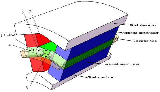 In Figure 7, the magnetic flux through the outer and inner permanent magnets is represented as and , respectively. The left air gap magnetic flux is composed of one magnetic flux tube 1, two magnetic flux tubes 4, and two magnetic flux tubes 5 in series; the magnetic flux is represented as . The magnetic fluxes of the air gap leakage for magnetic flux tubes 2 and 3 are and , respectively. The MMFs of the induced magnetic fields for the outer and inner permanent magnets are and , respectively. A single magnetic circuit divides the permanent magnet into two equal parts; therefore, the MR of the permanent magnet is . As the equivalent circuit is symmetrical, the MMFs of the induced magnetic fields on the left and right are both equal to . The directions of the magnetic flux and MMF depicted in Figure 7 are positive. The inner and outer steel drums are made of silicon steel with high permeability (the saturation permeability is approximately 4000 times that of air) and low conductivity (approximately 1/10 of the conductor tube). Thus, its MR is extremely small relative to the internal resistance of the permanent magnets and MR of the air gap. Hence, it can be ignored, that is, .