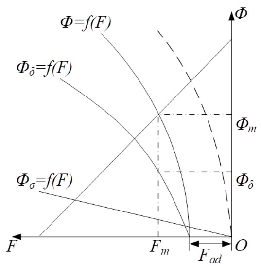 When making the permanent magnet equivalent to the series connection of the MMF and MR using the equivalent surface current method, the working point of the permanent magnet needs to be considered [23,24]. This point is located on the recovery curve. For a permanent magnet made of neodymium iron boron, the recovery curve is approximately a straight line, which coincides with the demagnetization curve at room temperature. By multiplying the abscissa and ordinate of the recovery curve () by the thickness along the magnetization direction and the cross-sectional area of the permanent magnet, the relationship curve between the permanent magnet flux and the MMF () can be obtained, as shown in Figure 6, where the characteristic curve of the permanent magnet outside the magnetic circuit is . When the permanent magnet coupling is stable, a slip speed exists between the permanent magnet and the conductor, resulting in an eddy current being induced in the conductor tube. The induced magnetic field generated by the induced eddy current imposes a reaction force on the original magnetic field. In Figure 6, the generated induced electromotive force is . Therefore, when calculating the permanent magnet working point, the external characteristic curve should be shifted to the left by . Then, the intersection point of the external magnetic circuit characteristic curve and the demagnetization curve will be (); that is, the permanent magnet will provide an MMF of and a magnetic flux of under this working condition.