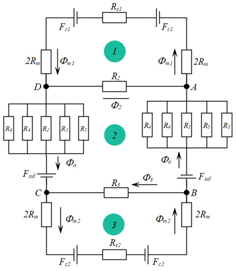 According to the equivalent circuit diagram shown in Figure 7 and Kirchhoff’s law for magnetic circuits, the following set of equations can be derived from points A and B and loops 1 to 3.