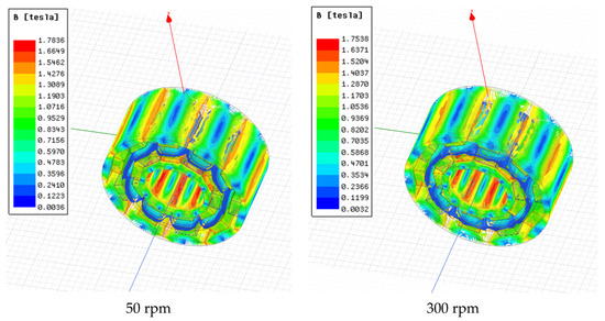 As shown in Figure 10, the area with the highest magnetic flux density in the conductor barrel is the area where the permanent magnet is mapped to the conductor tube. The maximum values are 1.85, 1.78, and 1.75 T when the slip is 20, 50, and 300 rpm, respectively. When the slip increases, the intensity of the magnetic induction decreases. This is because as the slip increases, the magnetic field generated by the conductor tube also increases, which causes the working point of the permanent magnet (Figure 6) to move toward the left; this, in turn, causes a reduction in the magnetic flux density.