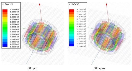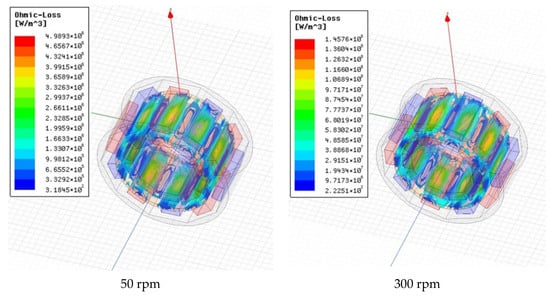 As shown in Figure 11, the direction of the eddy current in the conductor tube conforms to the direction determined by the right-hand spiral rule, and the center of the eddy current is located at the center of the two adjacent permanent magnet mapping areas. The magnetic field generated by the eddy current interacts with that of the permanent magnet to generate torque. The area with the highest eddy current density in the conductor tube is where the permanent magnet is mapped to the conductor tube. When the slip is 20, 50, and 300 rpm, the maximum eddy current density is , and , respectively. The induced current significantly increases with the increase in the slip, and this, in turn, increases the induced magnetic field. Therefore, the torque between the permanent magnet and the conductor tubes increases. However, the increase in the induced eddy current also increases the eddy current loss. According to Figure 12, the maximum values of the eddy current loss density under the three slips are , and ; an increase in the slip results in a significant increase in the eddy current loss. Hence, the heat generation of the permanent magnet coupling will significantly increase under high-load conditions.