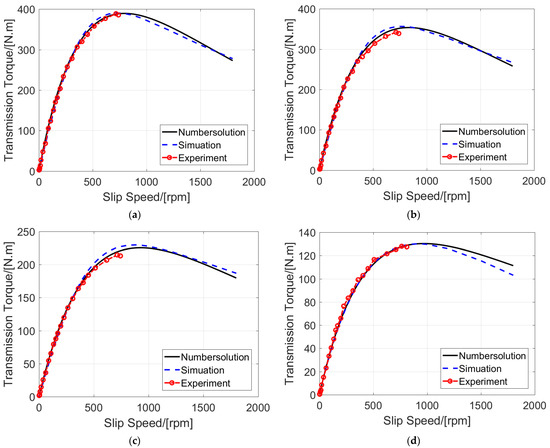 In Figure 14, it can be seen that the transmission torque of the CPMC increases with the slip speed. When the slip speed approaches 800 rpm, the rate of increase in the transmission torque decreases; when the slip speed is approximately 800 rpm, the transmission torque reaches the maximum value; and when the slip speed continues to increase, the transmission torque decreases. This occurs because the increase in the slip speed causes an increase in the magnetic induction line cutting speed of the conductor tube as well as a gradual increase in the induced eddy current. Ampere’s force that is generated by the induced eddy current also increases gradually, leading to an increase in the transmission torque. However, when the slip speed is sufficiently high, the induced magnetic field formed by the induced eddy current will impose a reaction force on the original permanent magnet, which is reflected by the low-efficiency position of its working point. In addition, the skin effect gradually increases with the slip speed. Hence, the transmission torque gradually decreases when the slip speed is greater than 800 rpm.