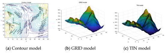 Commonly used DEM data representation models are the contour model, regular grid model (GRID), and irregular triangular network model (TIN), as shown in Figure 1. The contour model emphasizes the topography features through contour lines, shows the steepness of the slope through the density between the lines, and can directly display the height of the terrain with elevation data. However, it cannot visually display the overall topography and geomorphology. Although the GRID model and the TIN model cannot display topographical changes in the form of data, they can intuitively reflect the general appearance of the terrain and have a higher degree of visualization.