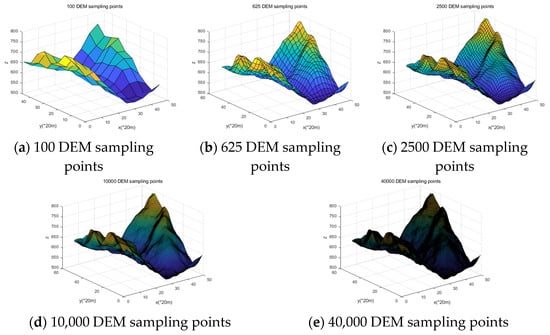 The amount of DEM data used to construct the surface model is closely related to the modeling accuracy. As shown in Figure 2, the higher the DEM data volume, the higher the sampling accuracy. It means the larger the data storage and the more complicated the calculation. Selecting appropriate modeling accuracy can reduce the number of model calculations and save time and cost while meeting the coverage requirements.
